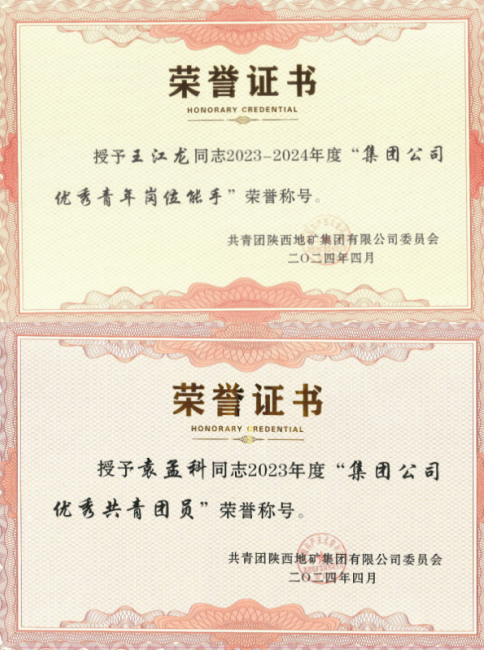 4月26日,在陜西地礦集團團委慶祝中華人民共和國成立75周年團青先進表彰暨“青春為中國式現代化挺膺擔當”主題培訓會上,我公司王江龍同志榮獲陜西地礦集團2023-2024年度“優秀青年崗位能手”稱號,袁孟科同志榮獲陜西地礦集團2023年度“優秀共青團員”稱號。